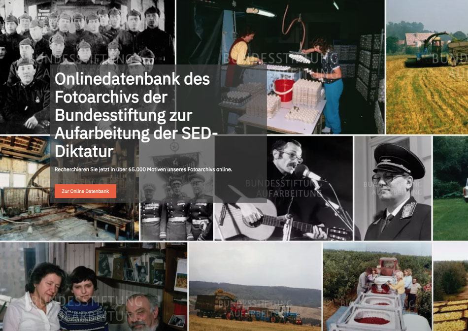 In der Onlinedatenbank des Fotoarchivs der Bundesstiftung zur Aufarbeitung der SED-Diktatur finden Sie derzeit etwa 65.000 Fotos, die unter Beachtung der Allgemeinen Nutzungsbedingungen verwendet werden dürfen. Der Umfang der Datenbank wird schrittweise ausgebaut werden.