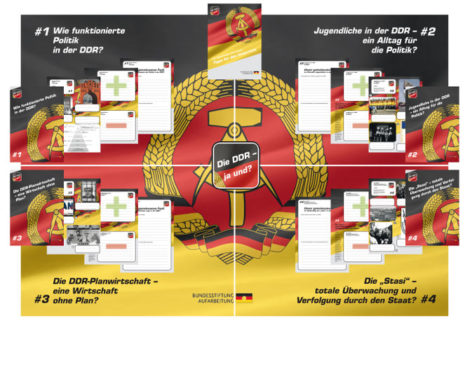 Hier finden Sie alle Inhalte des Projekts „Die DDR – ja und?#1" in digitaler Form. Alle Bestandteile wie die Informationsbroschüren für jedes Thema, die Lehrerinformationen, die vierteiligen Riesenposter, die „+ und -" sowie „Fazit" Bausteine und viele Bilder können in digitaler Form für die Projektumsetzung im Unterricht kostenfrei bestellt werden. Wenn Sie das digitale Projekt im Unterricht einsetzen möchten, bestellen Sie dieses bitte im MINTShop. Sie finden hier den direkten Link für die Bestellung!